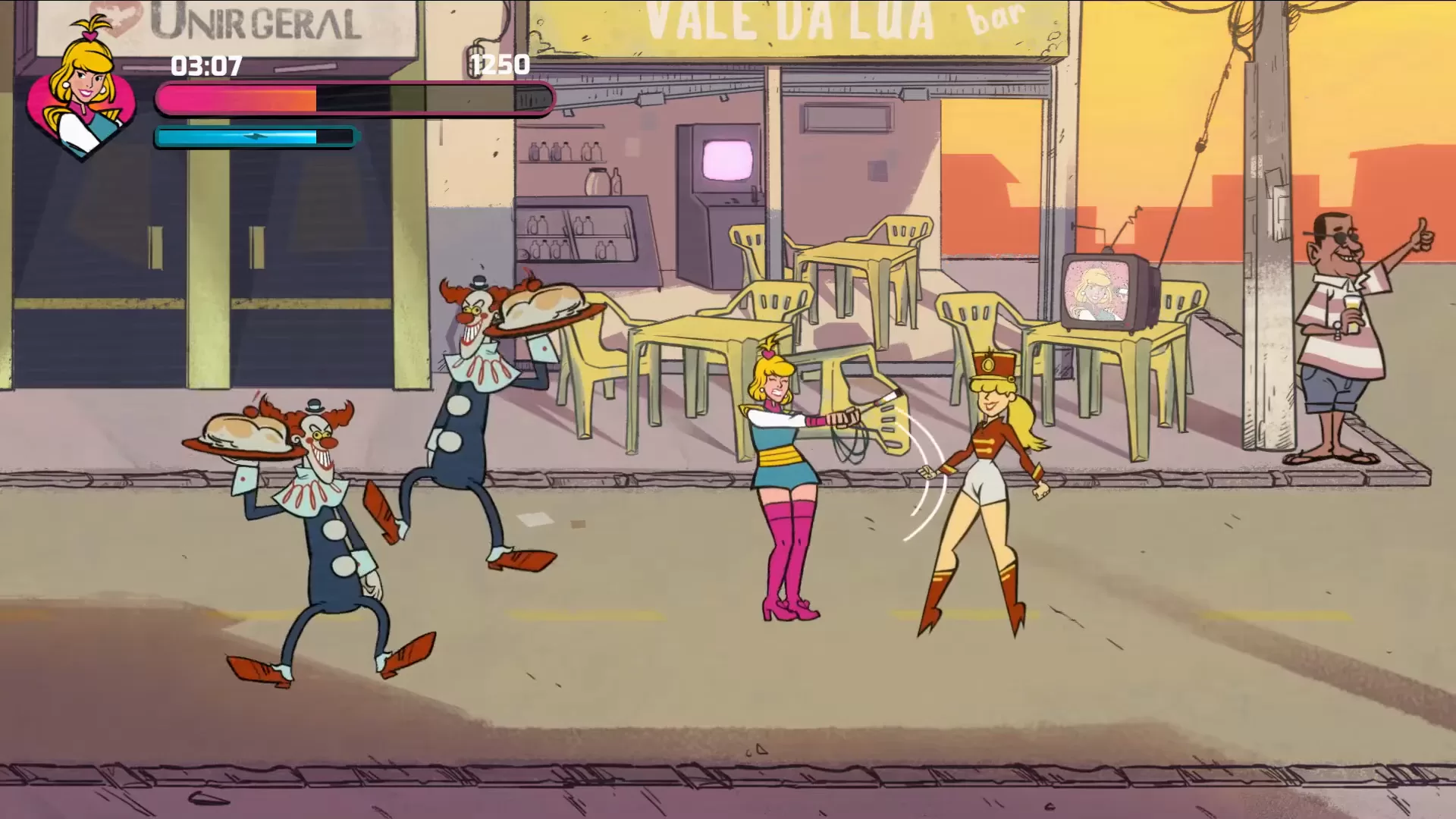 É um beat’n up da Xuxa nos anos 80 lutando para resgatar um mascote de TV infantil.