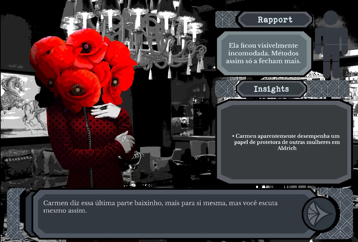 A primeira coisa que me chamou atenção nesse jogo foi a arte. O jogo é uma Visual Novel de investigação com elementos de adventures, lembrando jogos como Detetive. Você é uma investigadora que está investigando um caso que sequer teve autópsia, então precisará deduzir a arma do crime, o local e o assassino. A sensação é de você estar numa versão com narrativa mais pesada de um jogo de tabuleiro. A demo é curta e um tanto crua, mas o texto está legal e a arte do jogo toma direções interessantes, tem muito potencial.
