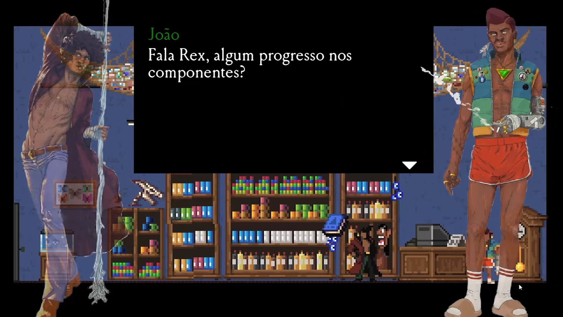 No caso, aqui você é Sasá, apresentadora mais famosa de um programa infantil e luta por cenários bem tipicamente brasileiros, e com monte de piadinha referenciando nossa cultura pop. As animações do jogo são tão legais e cada tela tem uma narração de TV sensacionalista contando a narrativa.