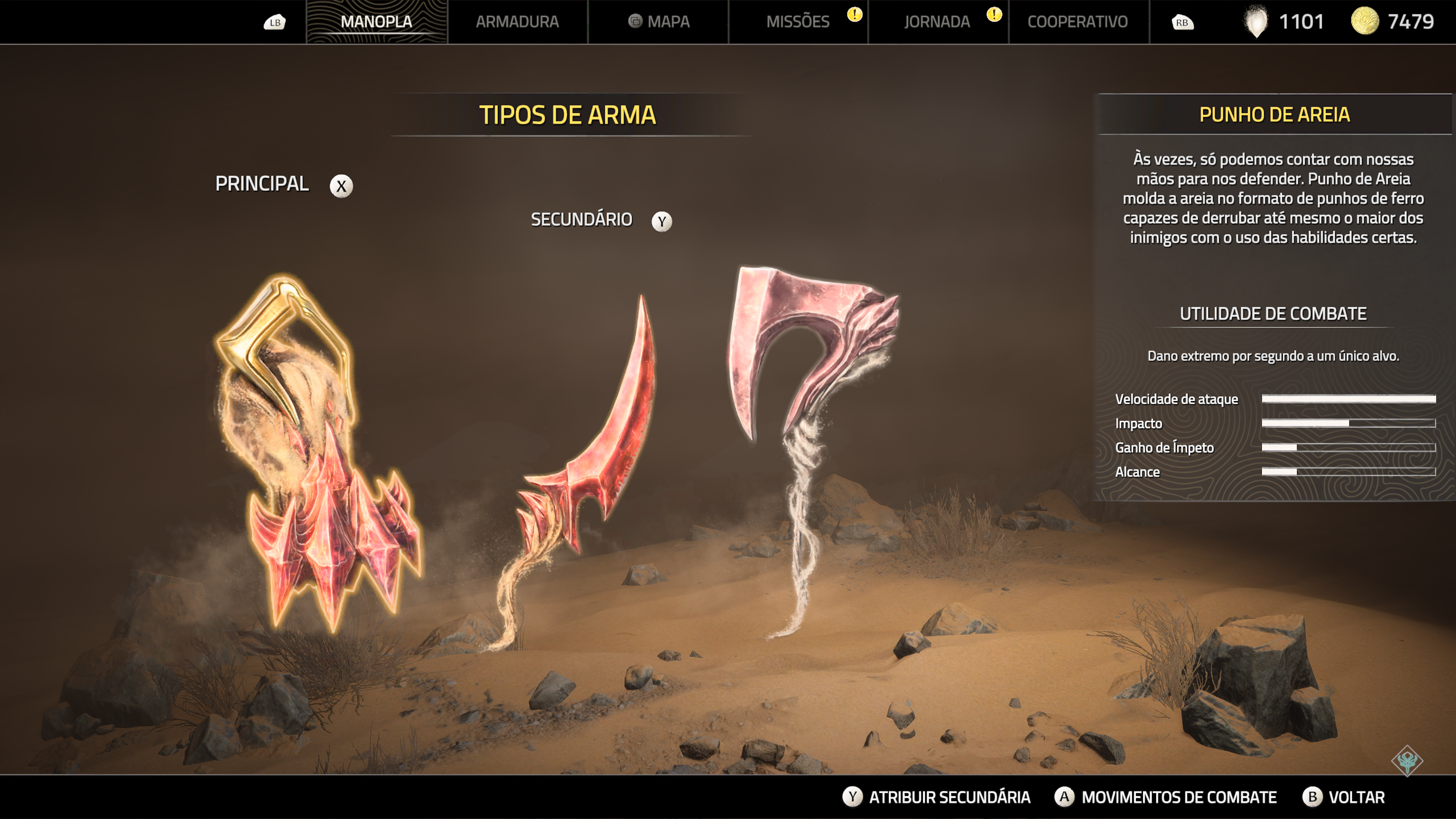 Ao ir preenchendo a Barra de Ímpeto, podemos também liberar um grande ataque, o Pulverizar, que dá um dano devastador aos inimigos em troca do ímpeto acumulado. Esse dano escalona com o quanto da barra o jogador preencheu. A pulverização é legal, mas sendo sincero eu usei pouquíssimas vezes, pois usá-la significa esvaziar sua barra em troca e então se o dano não fosse fatal, eu teria que recomeçar a encher a barra toda novamente para ativar minhas pedras e eu preferia ter minha build ativa a usar esse grande ataque.