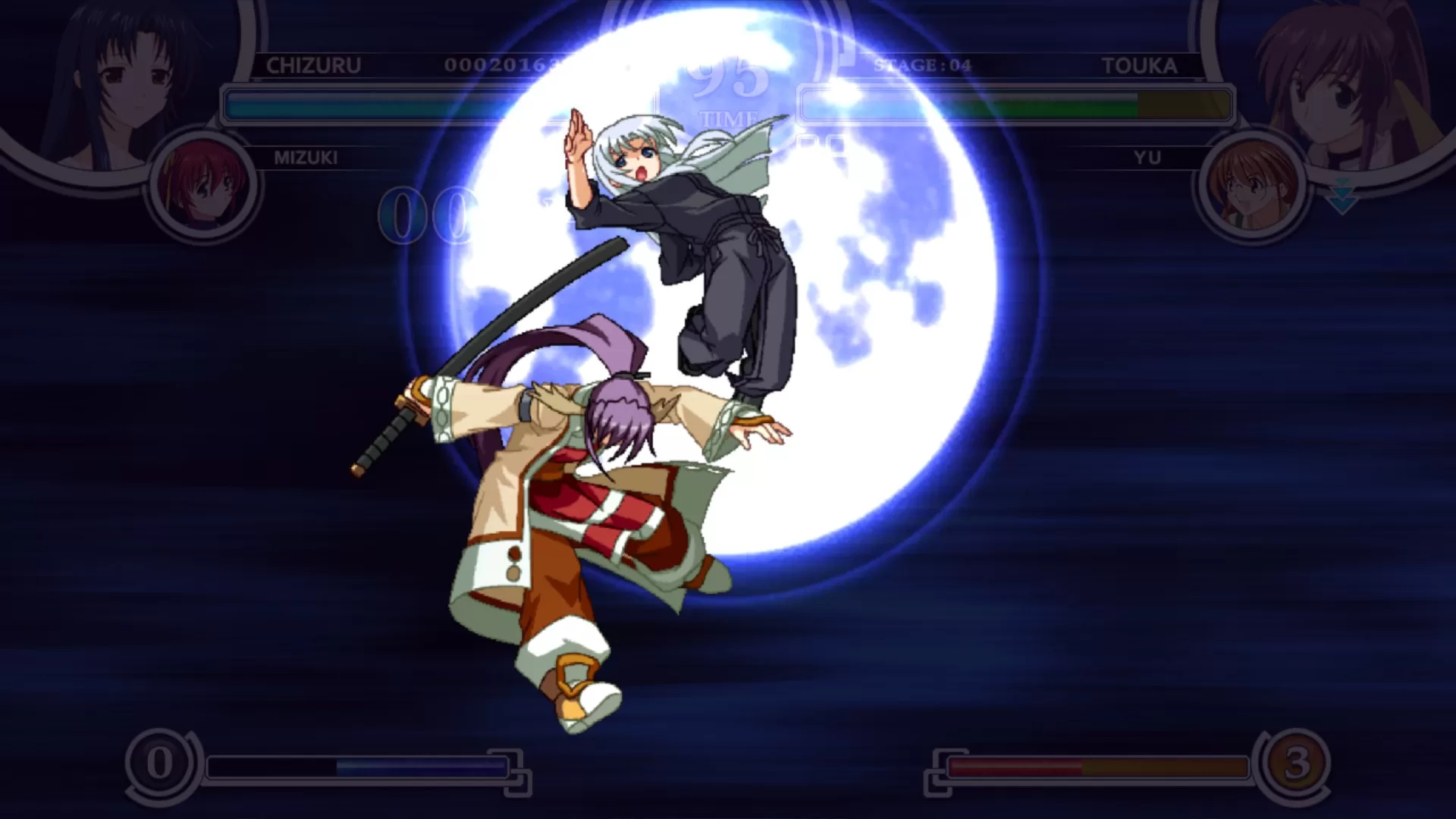 Temos dois modos de história no jogo, um deles sendo um extra chamado “another story”, versus, score attack, training mode, network e gallery, é realmente o básico do básico, mas levando em conta que é um jogo de baixo orçamento e o seu propósito era mais ser só um crossover da Aquaplus do que um jogo de luta de fato, dá para entender a simplicidade.