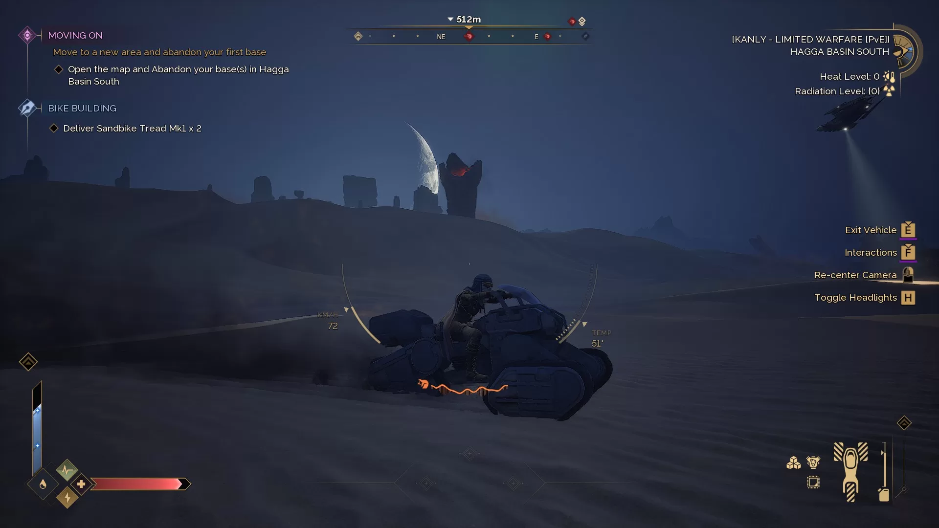Eu já gastei muitas horas em Rust, que é outro survival MMO com uma jogabilidade parecida com Awakening, porém mesmo estando acostumado com esse gênero, eu não estava preparado para o quão brutal Arrakis consegue ser. Enquanto os itens têm durabilidade, ao contrário de jogos em que você só os substitui ao quebrarem, aqui você pode consertá-los ao custo de uma porcentagem da durabilidade máxima. Isso permite que os recursos sejam balanceados de forma que construir um item essencial para sua sobrevivência seja uma verdadeira conquista, o que aumenta exponencialmente o prejuízo ao perder tais itens. Por sorte, a maioria das situações em que você pode morrer não vão custar seu inventário todo, apenas alguns itens e durabilidade, mas mesmo essas poucas perdas tornam o simples e necessário ato de sair de casa em busca de recursos algo estressante da melhor forma. E quando eu digo que a maioria das situações de morte não envolvem perda total de itens, é porque temos uma exceção: a sandworm. Uma criatura clássica do universo de Duna, a sandworm é literalmente uma minhoca gigante que vive nas areias do deserto e ataca pessoas que fizerem barulho ao cruzá-lo. Dada a natureza da criatura, um bicho gigante que engole você e seu veículo de uma vez, faz sentido que ela seja a única ameaça do jogo que leva todos os seus itens embora ao te engolir e o maior perigo das areias do vasto deserto.