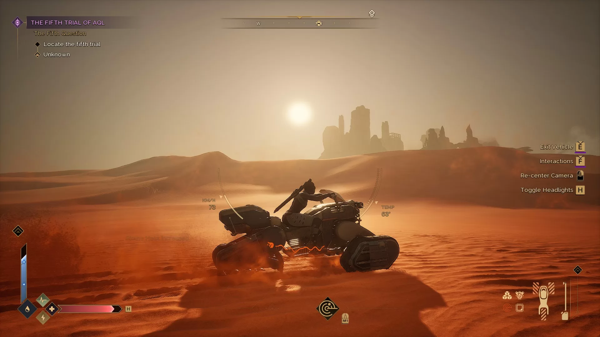 No artigo que mencionei no começo, eu dediquei parte das minhas impressões do jogo a como eu tinha ficado um pouco decepcionado com a sandworm na ocasião. Mesmo descontando o fato que não existia a tensão de morrer em uma demonstração limitada, senti que a inteligência artificial da minhoca era muito leniente e irregular, a ponto que ela não me impressionou. A versão final, porém, sanou todas as minhas preocupações, entregando uma presença ameaçadora e consistente. Cruzar trechos mais longos do deserto enquanto checa o medidor de vibrações (que indica quando a sandworm te nota) nunca deixou de ser assustador, principalmente quando o jogo começa a introduzir diferentes tipos de areia que podem chamá-la mais rápido ou te deixar preso no meio do nada. Com o quão devastador pode ser um deslize que te coloque em meio aos dentes dessa criatura, cada retorno seguro de uma exploração passou a ter mais significado e trazer um grande alívio.